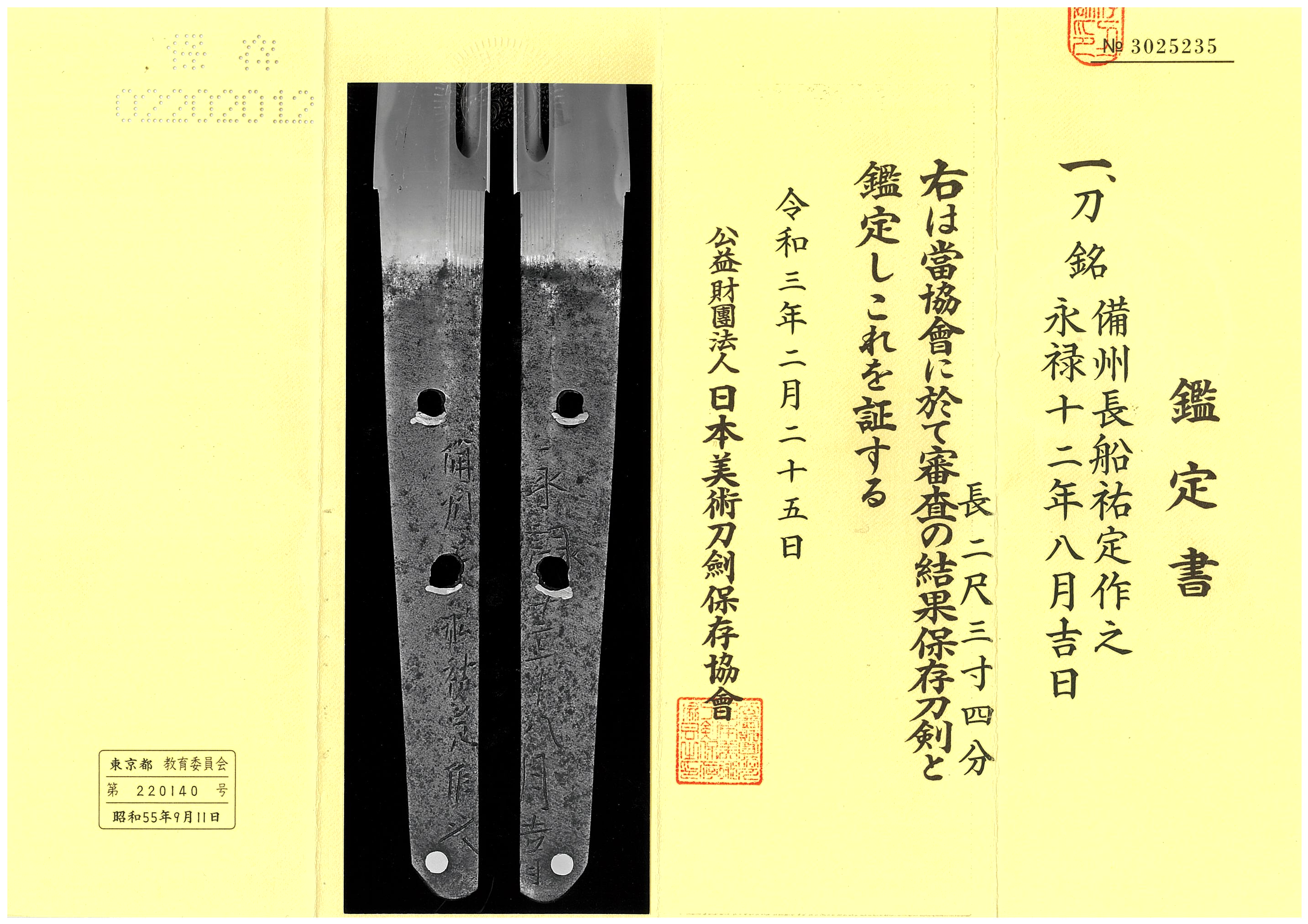 商品番号:Q-228 刀 備州長船祐定作之 永禄十二年八月吉日(一五六九) 保存刀剣鑑定書付き 肥後拵え付き(特別保存刀装具鑑定書付き)