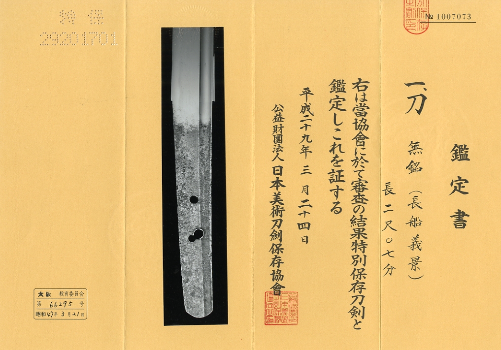 本作は、大磨り上げ無銘ながら、『長船義景』の極めが付された一振りです。
