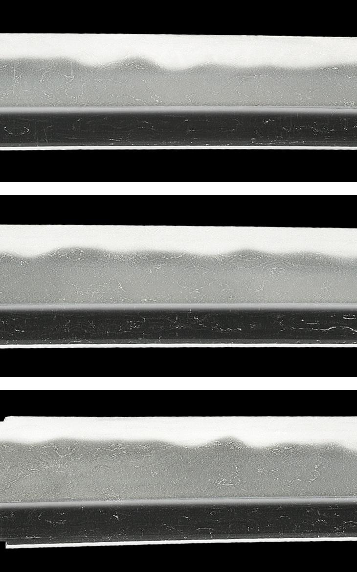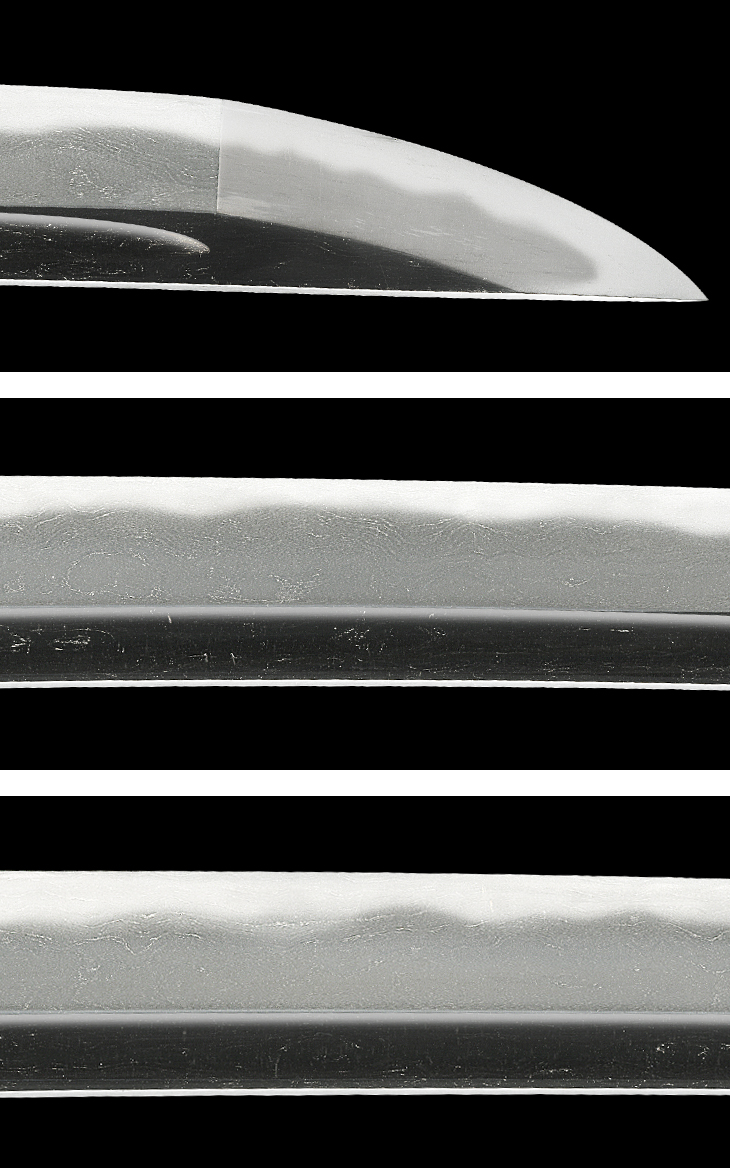 南北朝期特有の幅広で切っ先の延びた大柄な姿、小湾れ、小互の目、小丁子、角張った刃、尖り風の刃など、多種の刃を交え、総体的に焼き刃が小模様となり、薙刀や薙刀直しが多く見られるのも特徴です。