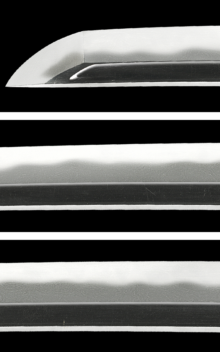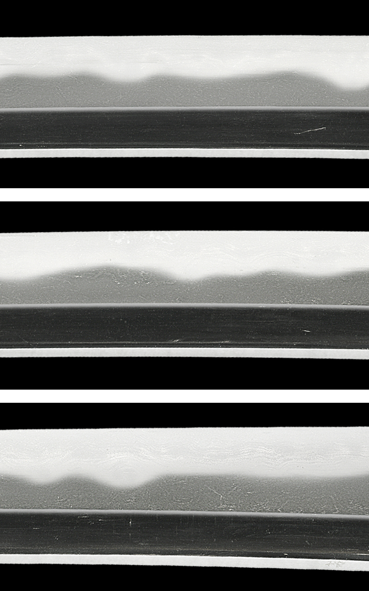 応永備前の作風は、互の目丁子刃を主体にして、一見鎌倉期の一文字派の作域を思わせるものがありますが、焼き刃に腰開きの乱れが目立つ点、応永杢と呼ばれる板目に杢目が目立って肌立つ点、直調の映りが多い点、乱れ込んで先が尖って返るローソク帽子などに、応永備前ならではの特徴が見られます。