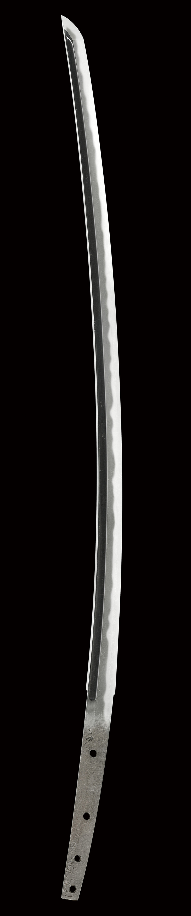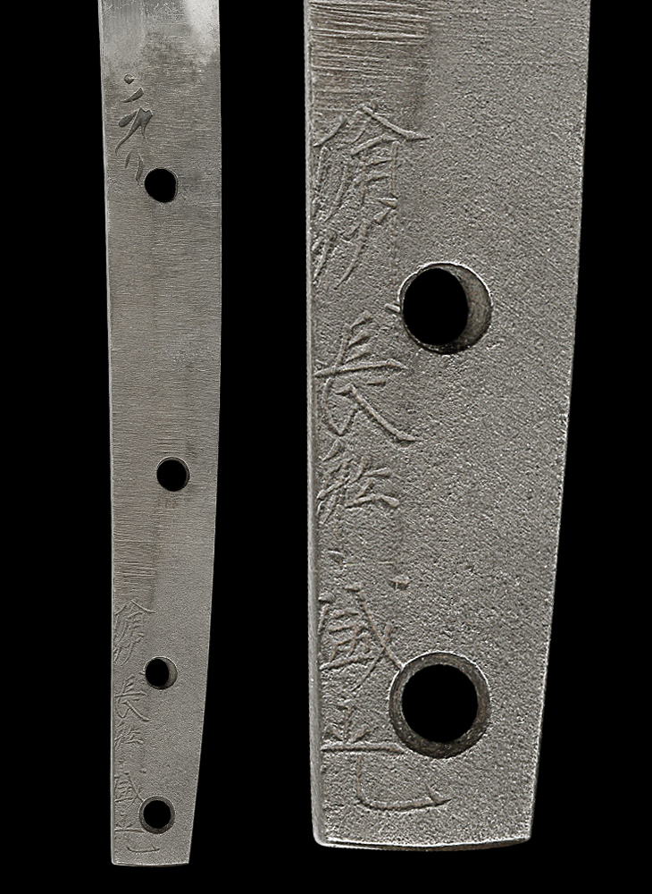 一番下が生ぶ穴で、佩表茎に残された梵字の位置からして 四寸弱磨り上がっていますので、元来二尺五寸程あったことが分かります。
