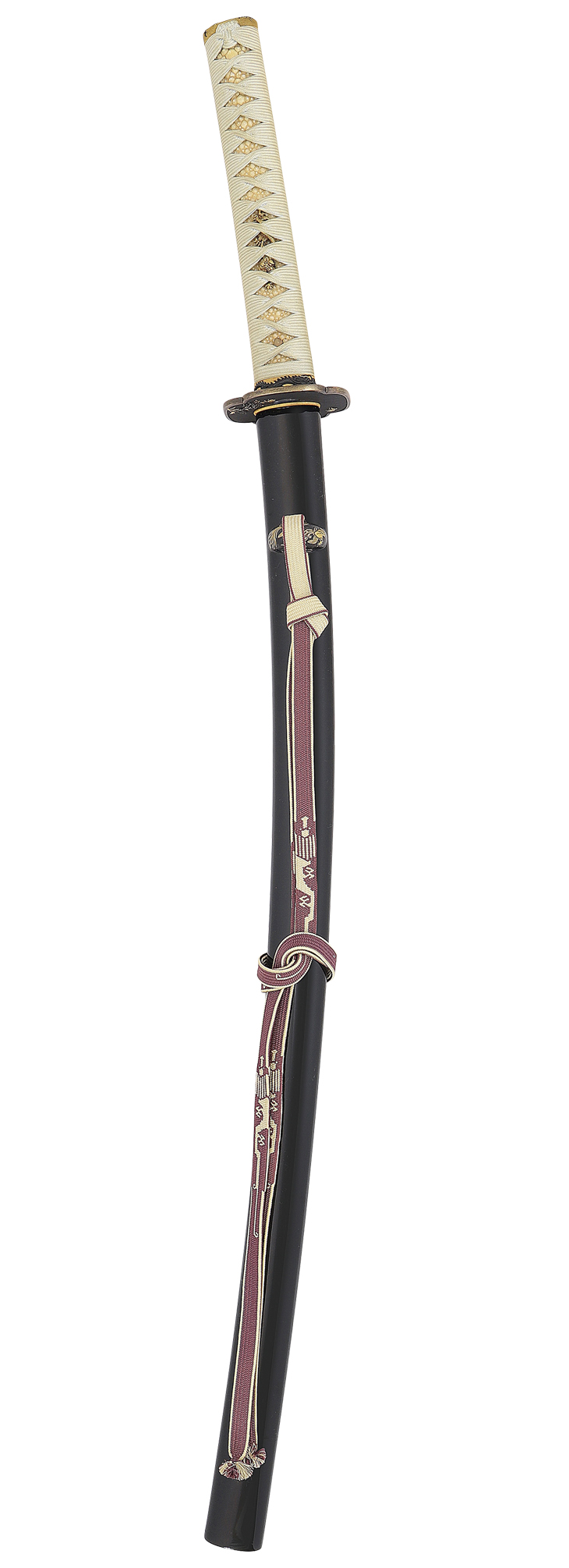 打ち刀拵え(全長94 柄長23.7 江戸末期 鞘 黒の呂塗 栗型、赤銅魚子地高彫金色絵、鳳凰図 下げ緒、卯の花に紫、の龍模様 柄 親鮫に卯の花柄巻き 縁頭、赤銅魚子地、地に金色絵、高彫部分に赤銅色絵、這龍図 鍔 赤銅縦魚子地木瓜形高彫色絵、銀覆輪 牡丹花に蝶図 銅に金着せ切羽)付き。