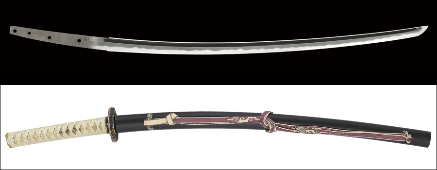 鎬造り、鎬尋常庵棟低め、中切っ先。 表裏共に棒樋をハバキ下で丸留めにし、表は茎に梵字残る。 鍛え、板目に杢目、流れ肌を交え、所々大模様に上品に肌立ち、地沸厚く付き、地景繁く入り、乱れ映り立ち、地鉄良好。 刃文、小互の目丁子乱れを主体とし、小丁子、小乱れ、尖り風の刃を交え、刃縁良く沸付いて明るく締まり気味となり、刃中葉、小足、丁子足繁く入り、金筋、砂流し烈しく掛かる。 帽子、乱れ込んで先尖り心に掃き掛け返る。 茎磨り上げ、先切り、鑢切り。 銅に金着せ二重ハバキ。 時代研磨。 白鞘入り。