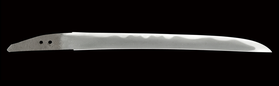 平造り、三つ棟低め。 鍛え、小板目に板目交じり、所々流れて肌立ち、地色やや黒み勝ち、ほのかに白け映り立ち、地景入り、地沸厚く付き、地鉄良好。 刃文、互の目、箱掛かった刃、小互の目、湾れを交え、焼きに高低があり、表裏の刃文比較的良く揃い、刃縁匂い勝ちに小沸付き、やや沈み勝ちに締まる。 帽子、湾れ調で先小丸風に返る。 茎生ぶ(タナゴ腹形)、先急な刃上がりの入山形、鑢切り。 銅に銀着せバキ。 時代研磨。 白鞘入り。