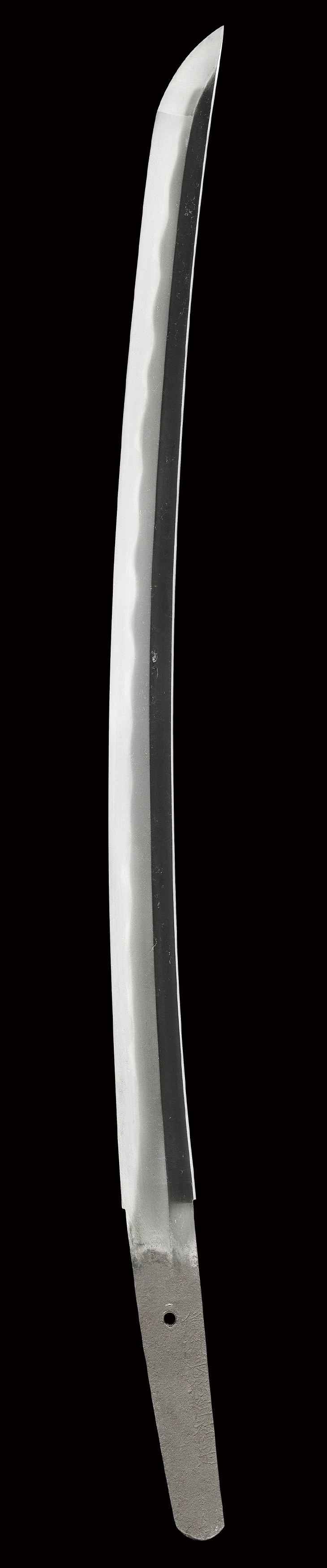 本作の銘はやや厳しい感じですが、時代的には室町末期の作で良いでしょう。互の目に小互の目、丁子風の刃、やや角張った刃を交えて、刃中互の目足、丁子足、葉入り、金筋、砂流し掛かるなど、刃が健全で良く出来ています。地に鍛え肌等もありますが、真面目な作です。