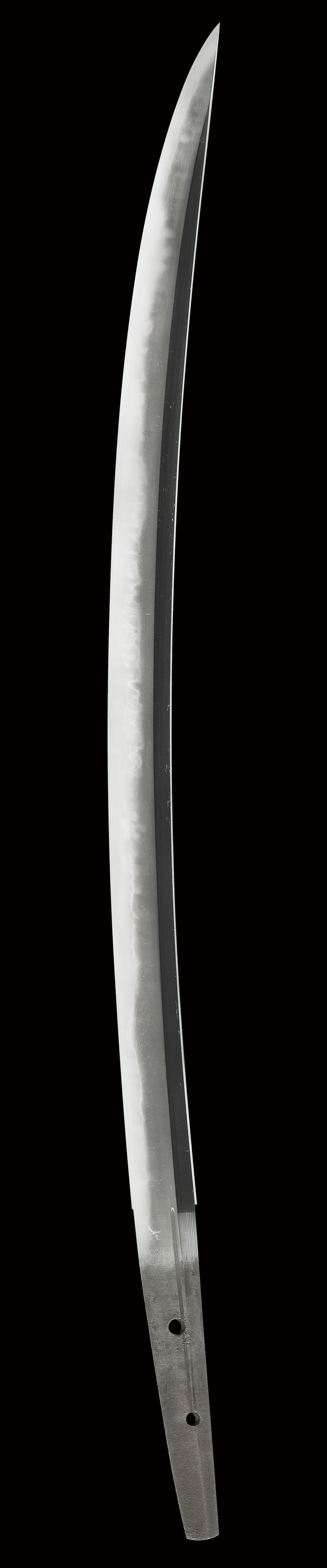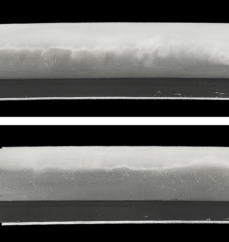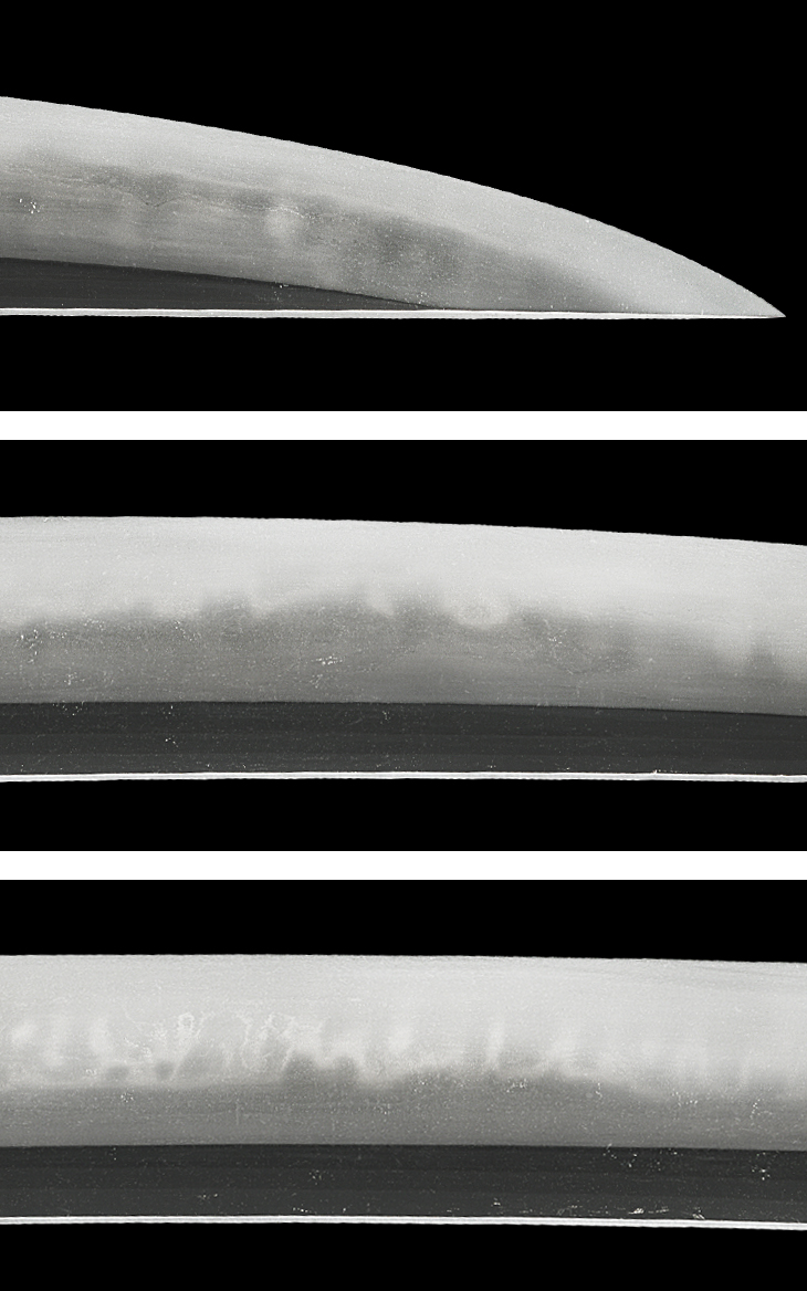 寸法一尺五寸弱、乱れ映り判然と立つ綺麗な地鉄、匂い出来で多種の刃を交えた焼き刃は、刃中も細かに良く働いています。所々少し刃が潤むような箇所もありますが、表の中央付近には、特に刃幅広く、良く冴えた明るい刃が見られます。