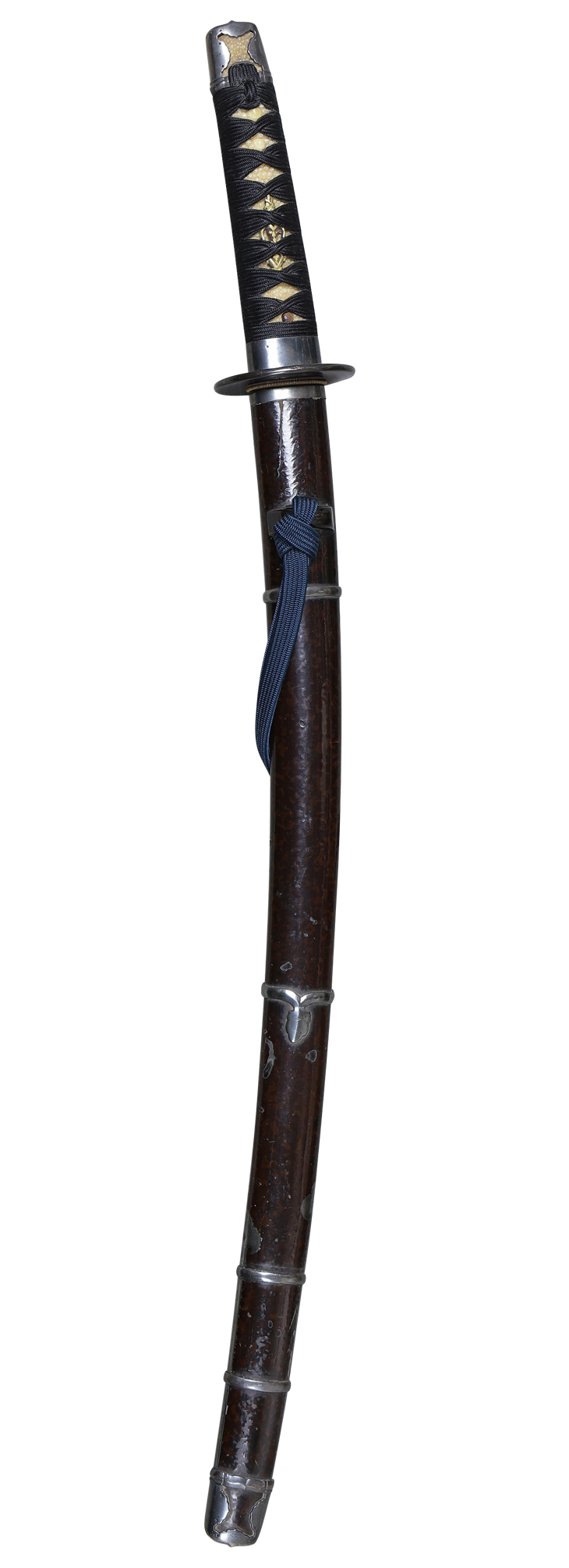 半太刀風脇差拵え(幕末期 全長68.5 鞘 焦げ茶変わり塗 小柄、赤銅魚子地高彫色絵、鶴の図 金具類一作 銀研磨地無文 鞘 親鮫に黒柄巻 目貫、図不明 鍔 赤銅研磨地長丸形無文)付き。