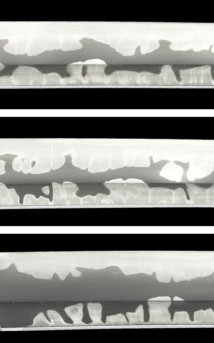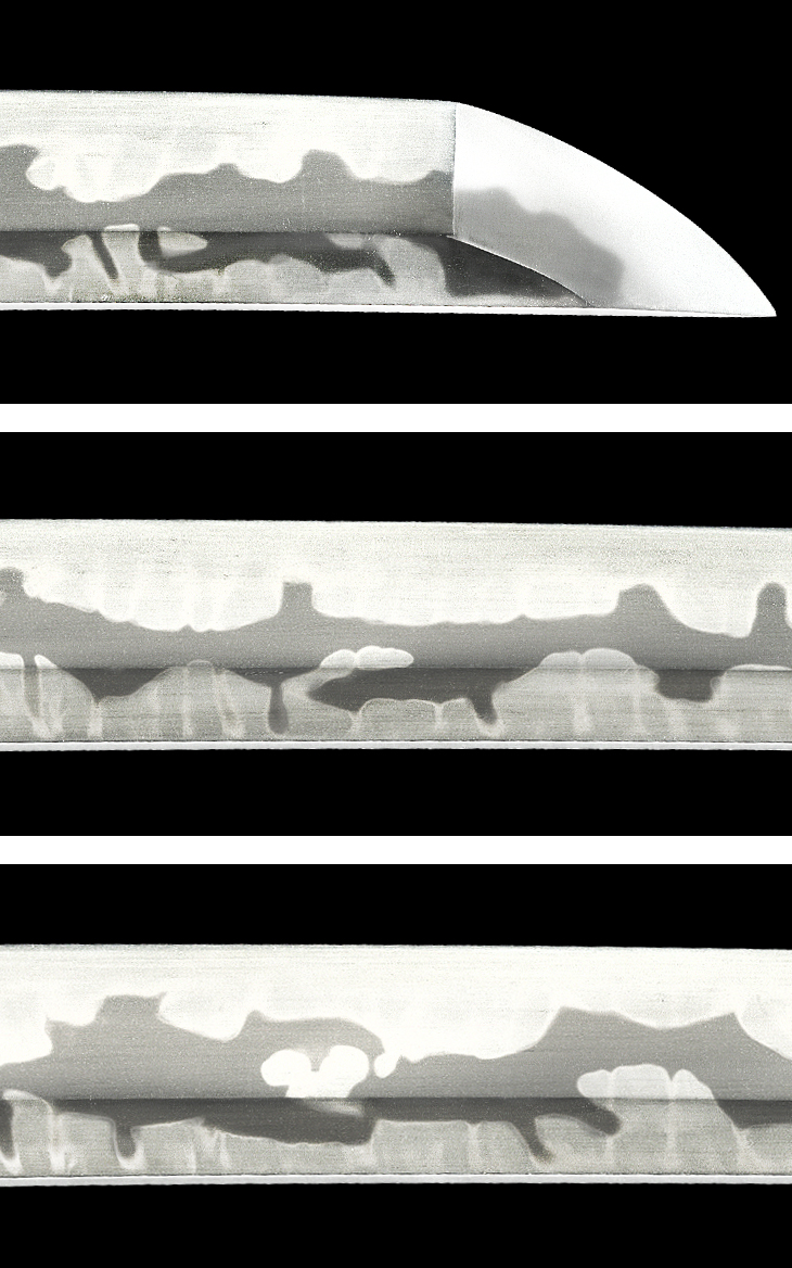 互の目乱れを主体の刃は、小互の目、大房丁子、小丁子等を交えて華やかに焼き、刃縁明るく締まり、刃中互の目足、丁子足盛んに入り、地に大小の飛び焼き掛かり、鎬地も元から先まで同様に烈しく焼きが入って皆焼となるなど、覇気溢れる素晴らしい出来映えです。