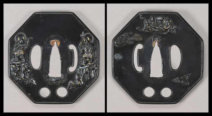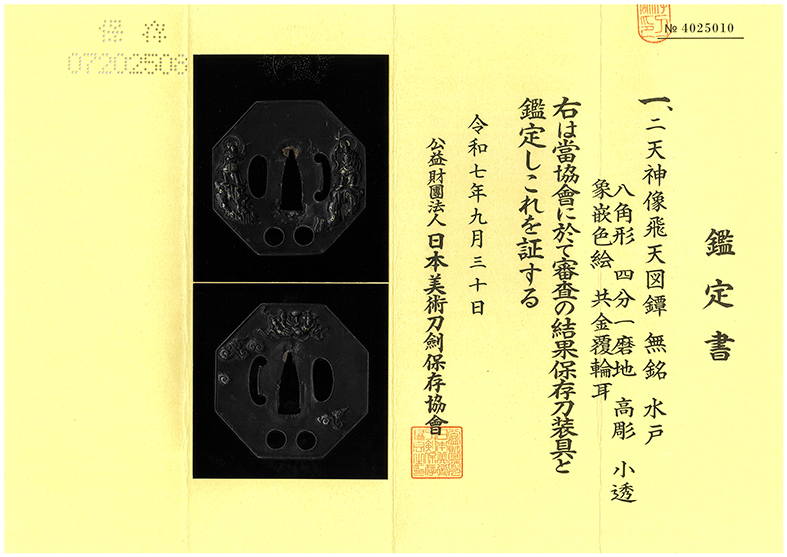商品番号:T-1230 鍔:二天神像飛天図 無銘水戸 保存刀装具鑑定書付き
