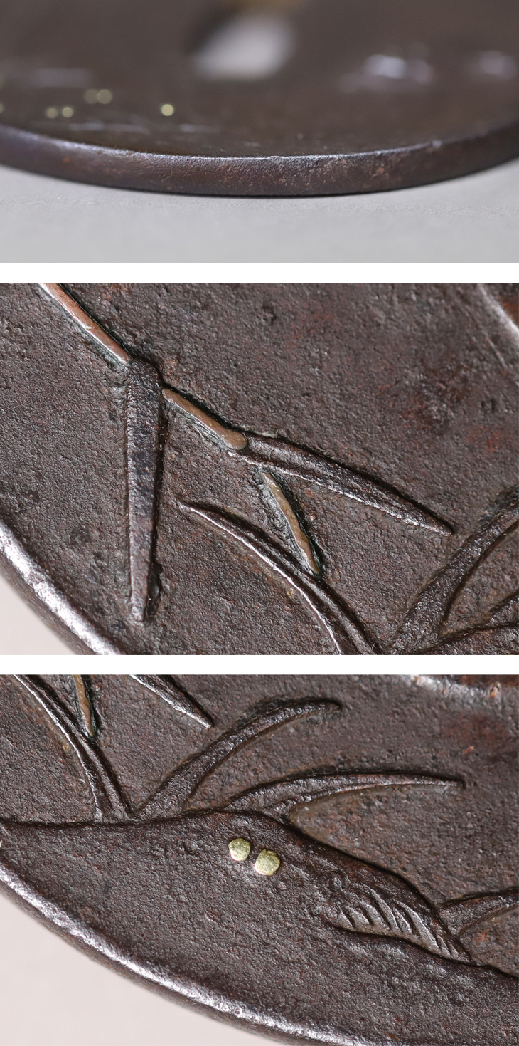 この鍔の蝙蝠も独特な表情を見せ、崑寛の蝙蝠目貫を彷彿とさせます。