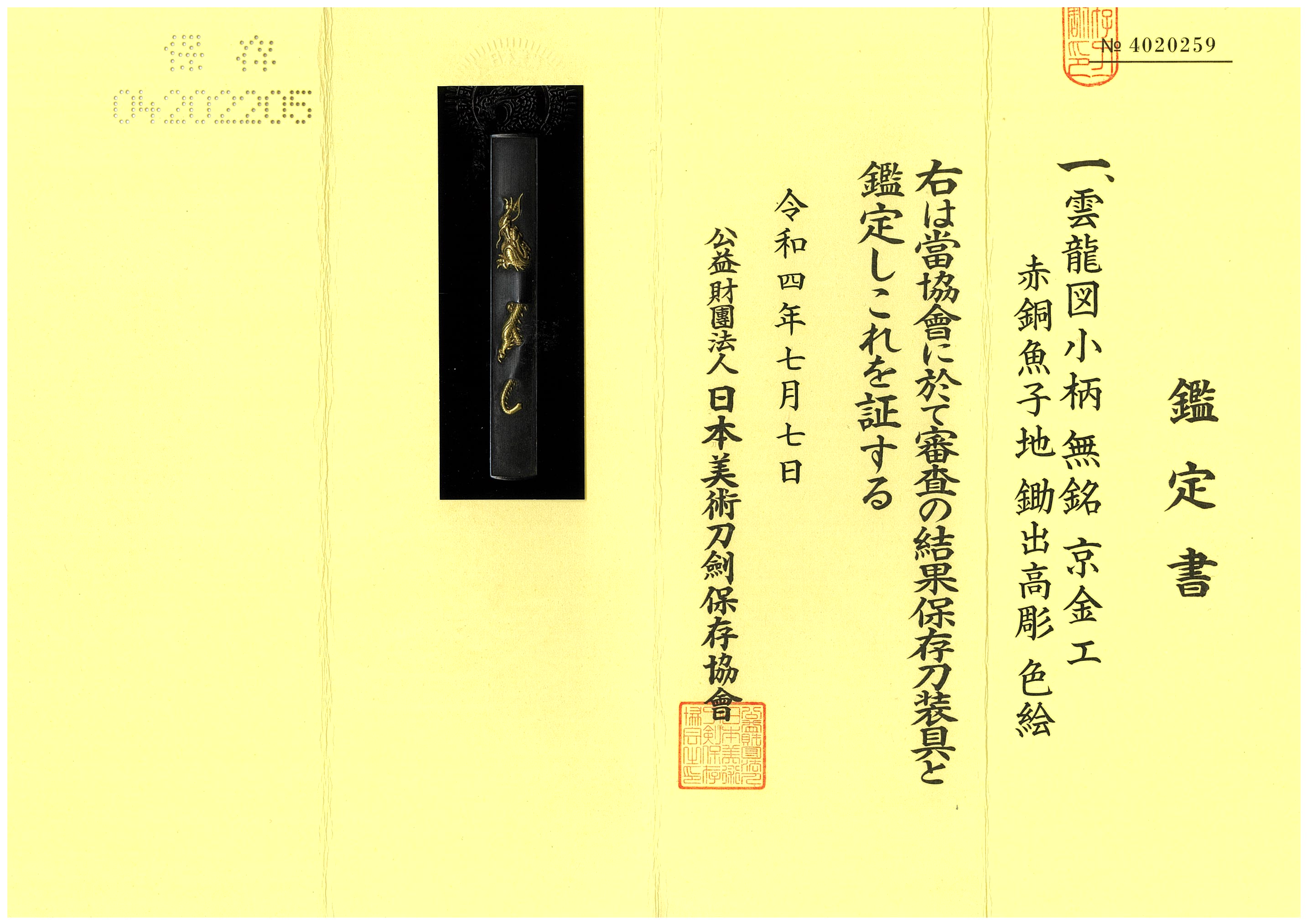 商品番号:T-1248 小柄:砂潜龍図 無銘京金工 保存刀装具鑑定書付き