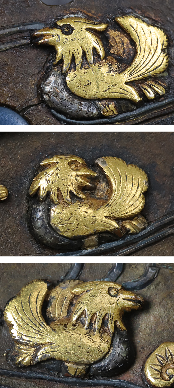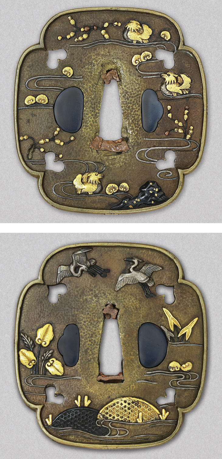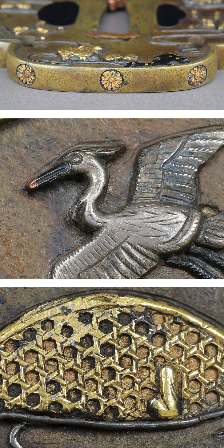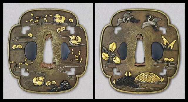 表に水辺に遊ぶ鴛鴦、裏に白鷺を配した如何にも京らしい優雅な意匠の鍔です。金、銀、赤銅、素銅で象嵌された鳥達、水の流れは銀の線象嵌、耳は菊紋が嵌め込まれた、おっとりとした京の雅を感じさせる鍔です。