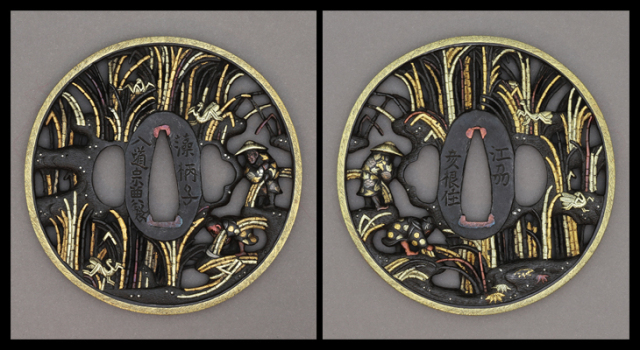 宗典とは、江戸中後期に江州彦根で活躍した鍔工です。華やかな彦根彫の図柄は当時から人気を博し、多くの偽作が作られていたと言います。