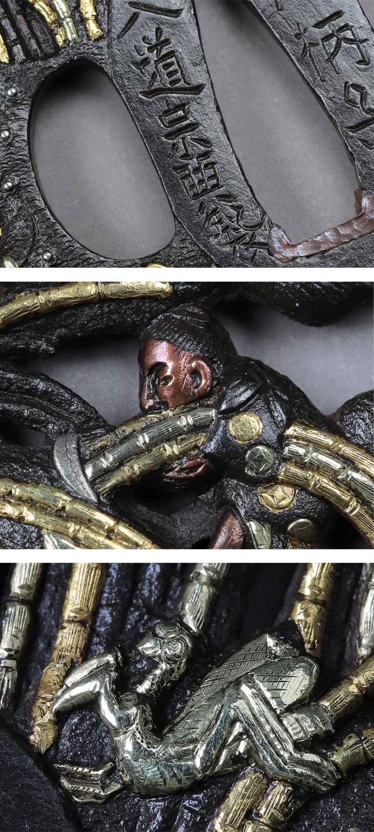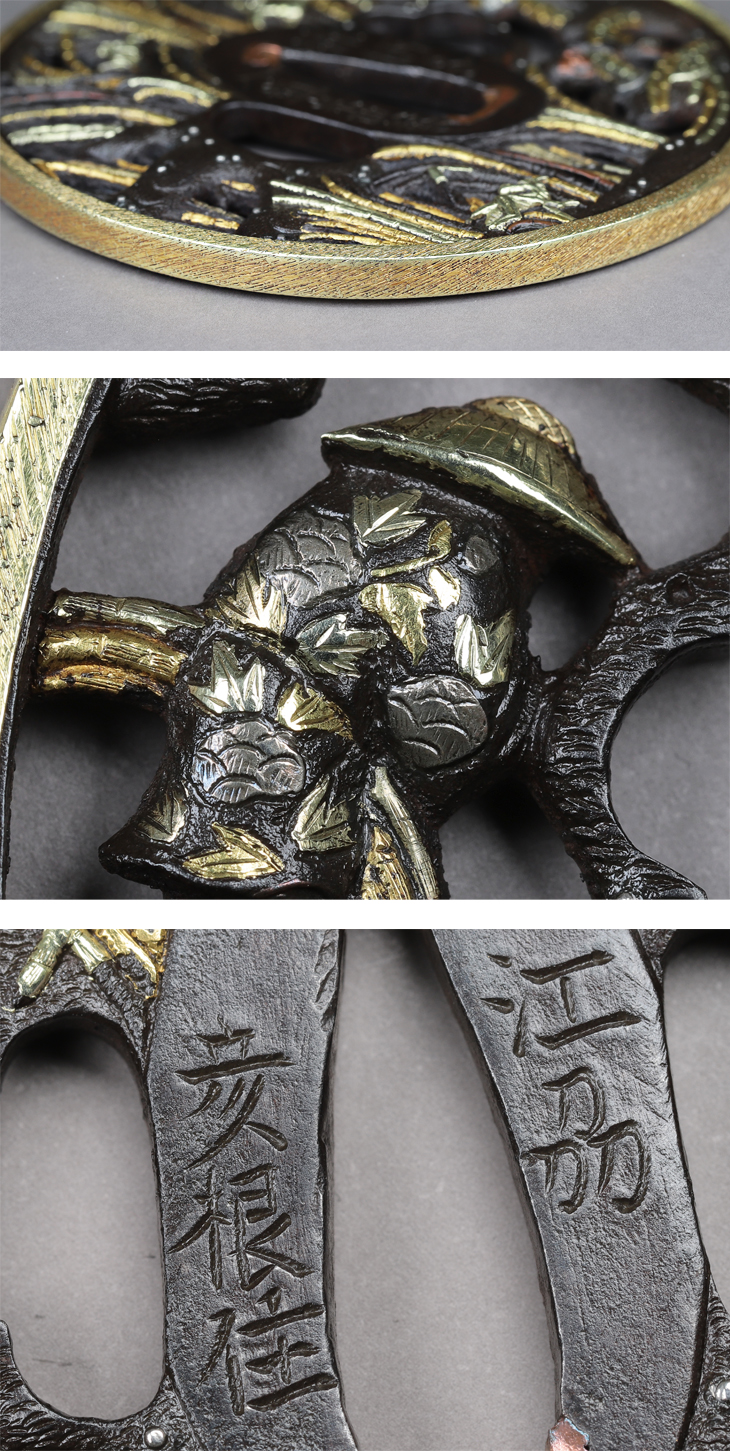 この鍔は、鍔面いっぱいに木賊、木賊狩りする人物、草間の螳螂が実に上手く肉彫透されています。そして金銀赤銅素銅の表情豊かな象嵌により、益々雰囲気ある作に仕上がっています。