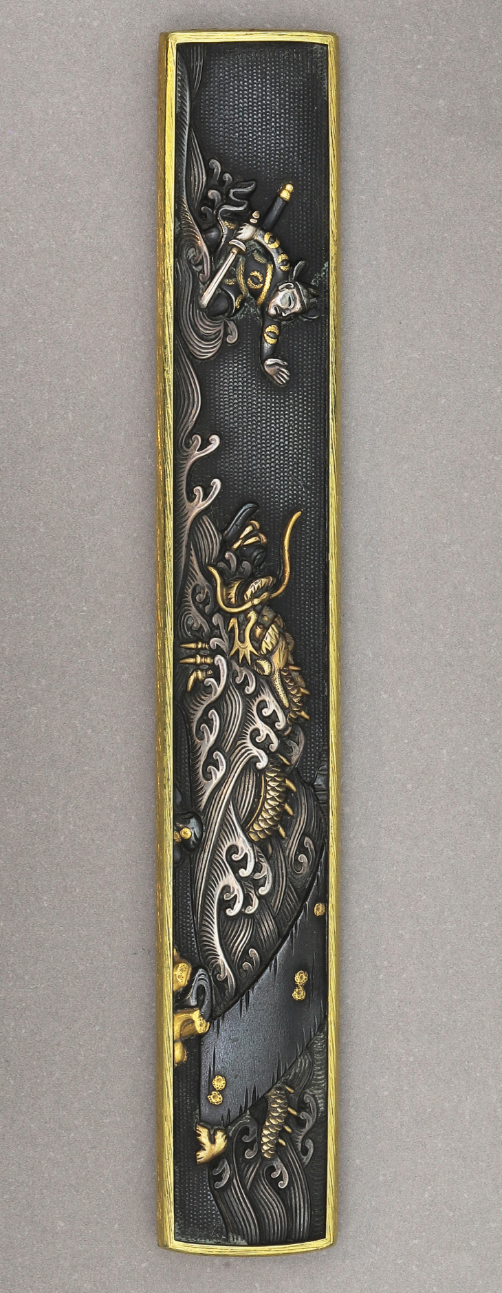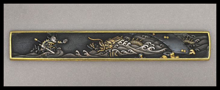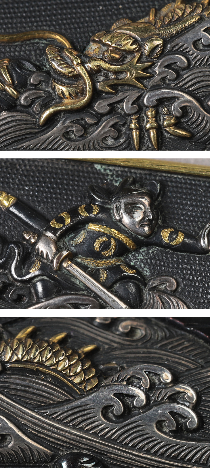 この小柄の意匠では大波の中、沓を咥えた大蛇に剣を持ち対峙する場面を描いています。