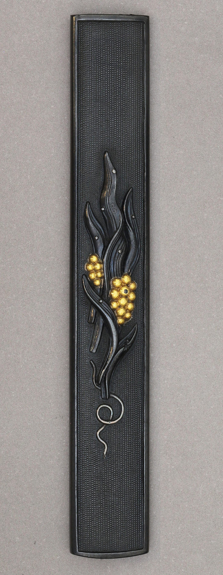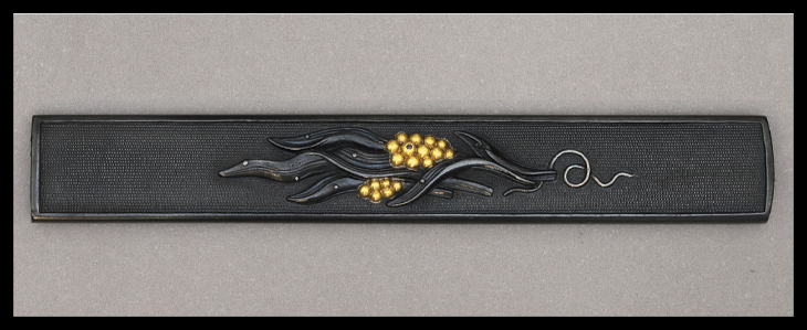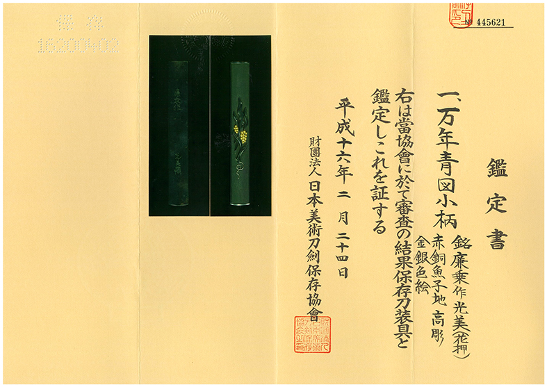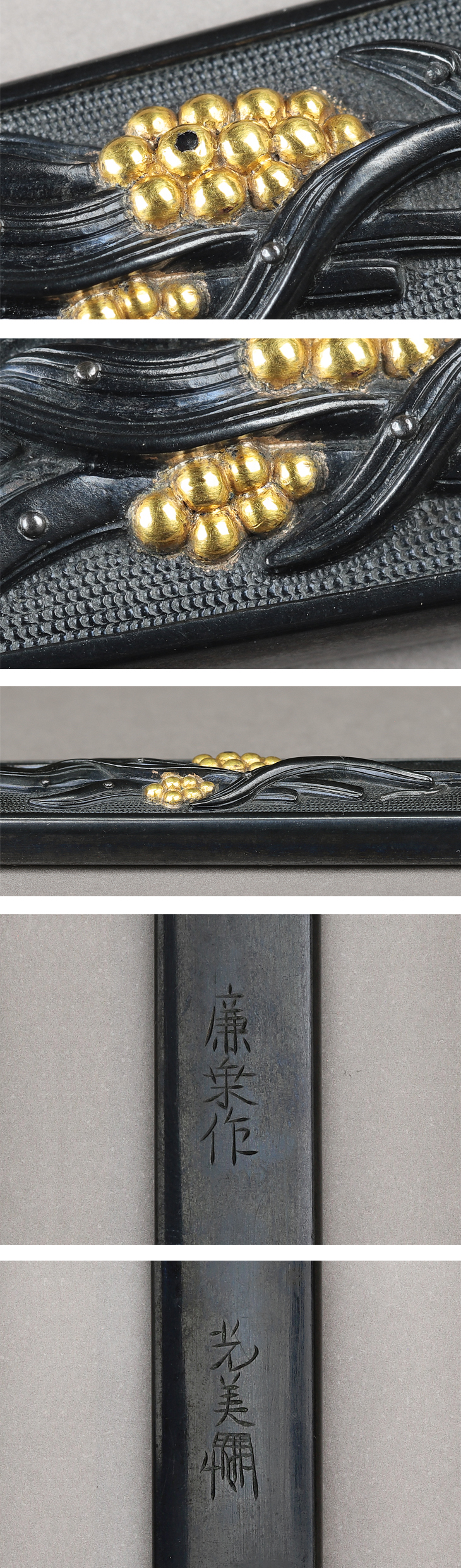 商品番号:T-1260 小柄:万年青図 銘・廉乗作 光美(花押) 保存刀装具鑑定書付き