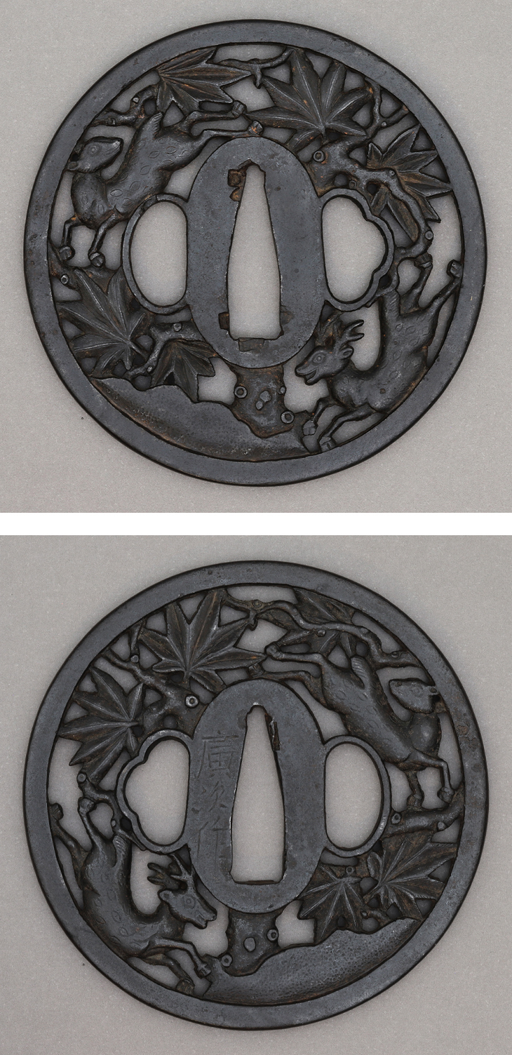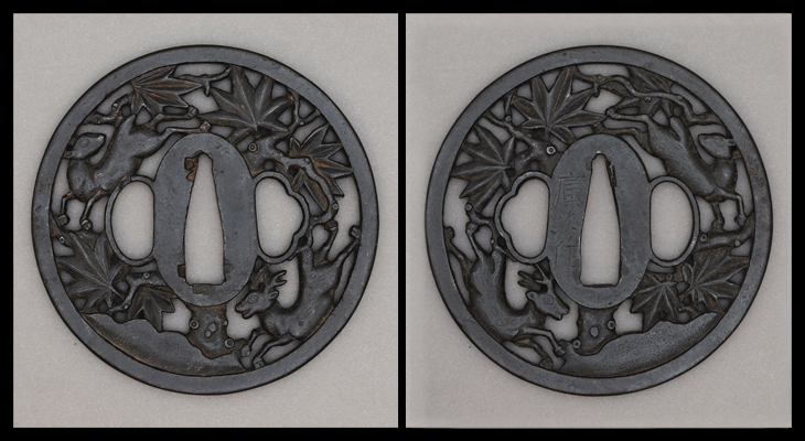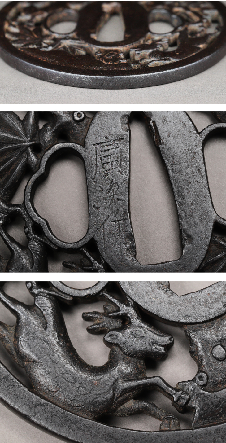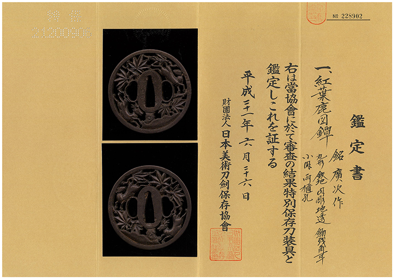 商品番号:T-1263 鍔:紅葉鹿図 銘・廣次作 特別保存刀装具鑑定書付き