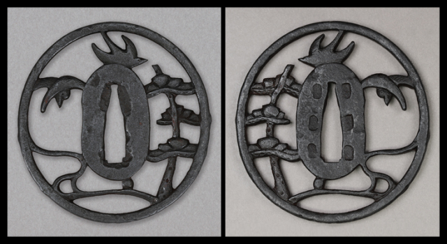 この鍔も小ぶりながら頑強で、耳には激しく鉄骨が見られます。金山鍔には幾何学的で意味の分からない画題が多い中、この鍔は松と小禽と流水が丁寧に肉彫透された珍しい作。