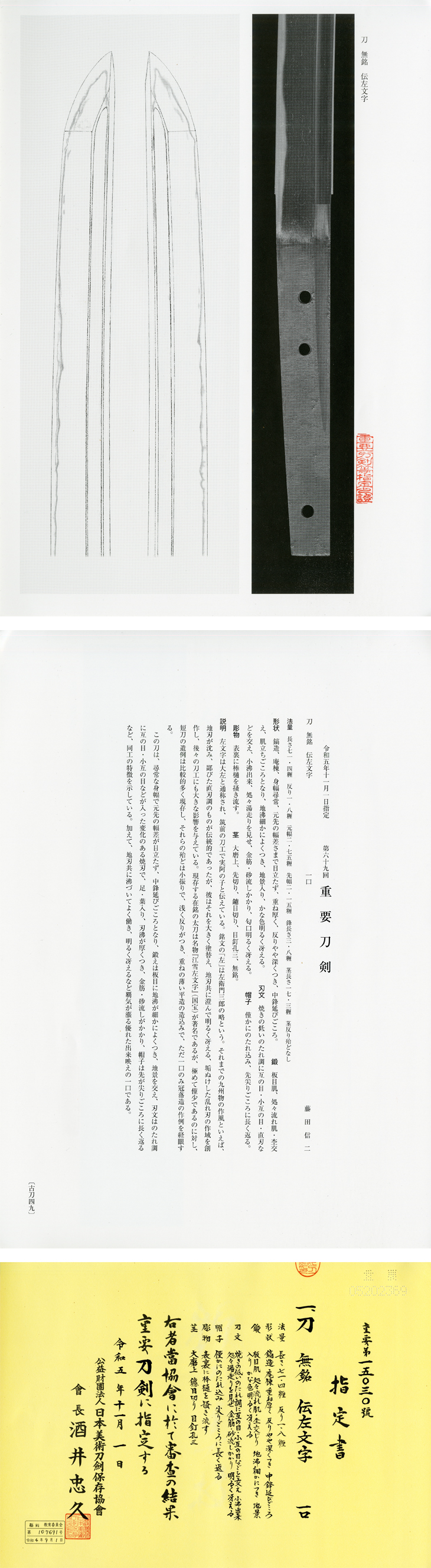 本作は、磨り上げ無銘ながら、『伝左文字』の極めが付された優品、令和五年(二〇二三)、第六十九回の重要刀剣指定品です。
