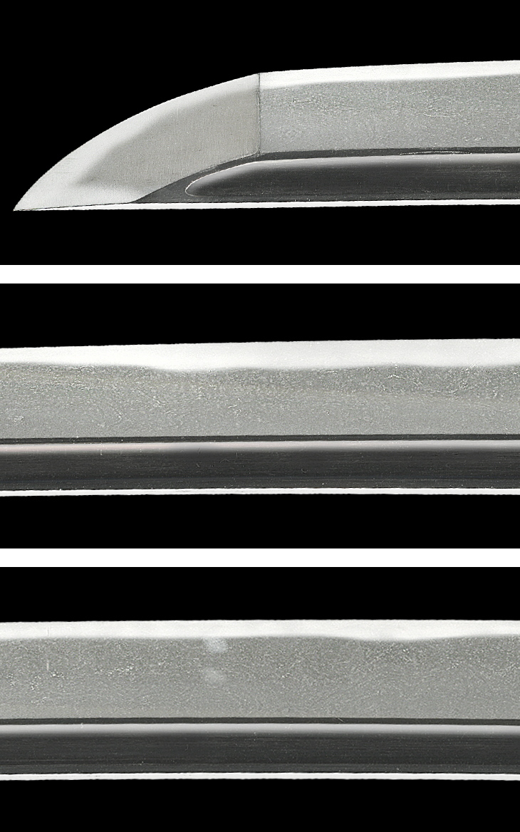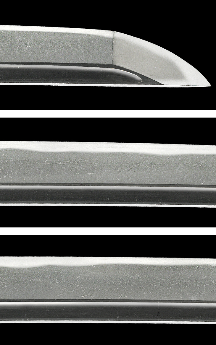 鎬造り、鎬高く庵棟低い、中切っ先やや延び心。 表裏共に棒樋を茎途中で掻き流す。 鍛え、板目に杢目、流れ肌を交えて良く詰み、地沸微塵に厚く付き、地景繁く入り、鉄良く冴え、ほのかに沸映り立ち、地鉄精良。 刃文、湾れ調の刃取りで、互の目、小互の目交じり、刃縁小沸付いて匂い深く明るく冴え、細かな湯走り掛かり、刃中葉、小足、小互の目足良く入り、金筋、砂流し掛かる。 帽子、湾れ調で沸付き、二重刃掛かり、先尖って掃き掛け深く返る。 茎大磨り上げ、先切り、鑢切り。 白鞘入り。