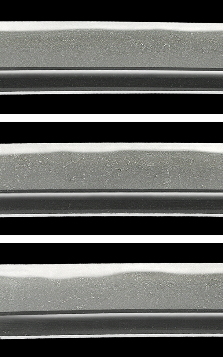 板目に杢目、流れ肌を交えて良く詰んだ精良な地鉄は、地沸微塵に厚く付き、地景繁く入り、ほのかに沸映り立ち、湾れ調の刃取りで、互の目、小互の目交じりの刃は、刃縁小沸付いて匂い深く明るく冴え、細かな湯走り掛かり、刃中葉、小足、小互の目足良く入り、金筋、砂流し掛かっています。帽子も湾れ調で沸付き、二重刃掛かり、先尖って掃き掛け返るなど、典型的な左文字帽子となっています。