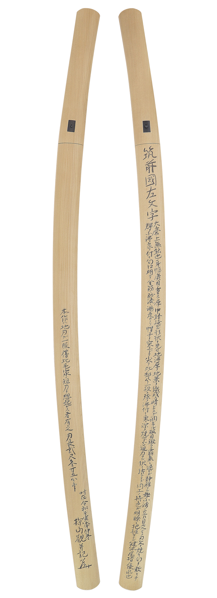 また同工は、藤四郎吉光、新藤五国光らと並び立つ短刀の名人で、短刀のみで『太閤左文字』など国宝二、『小夜左文字』など重要文化財四、重要美術品四振りを数えます。一方で在銘太刀は極めて少なく、国宝名物『江雪左文字』、『筑州(以下切)(第五十回重要刀剣)』の二振りのみです。無銘刀ながら、本阿弥光徳の金象嵌銘入りの旧御物、『長(ちょう)左文字』なども有名です。