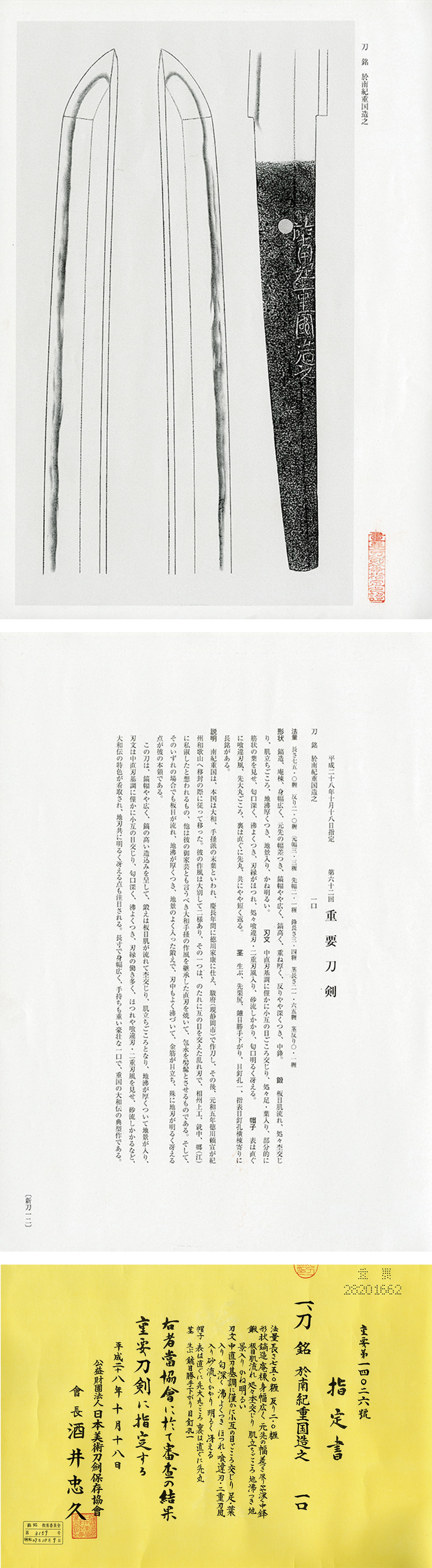 南紀重国(初代)の重要刀剣、新刀最上作、同工後期作の『紀州打ち』、大和伝の典型を示した優品、長尺豪壮で重量感溢れる新刀重要です。