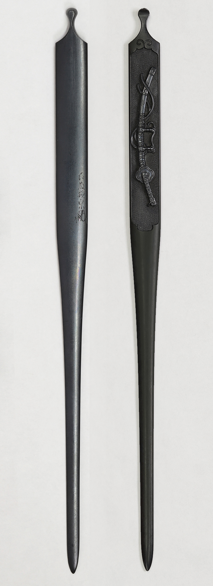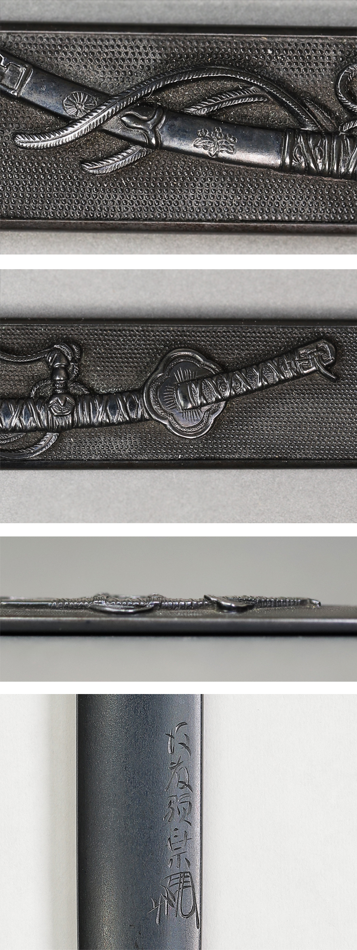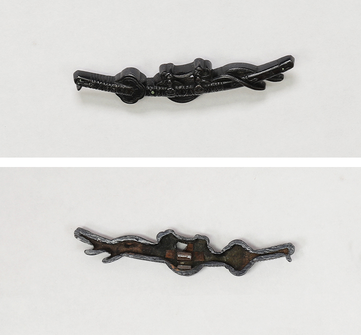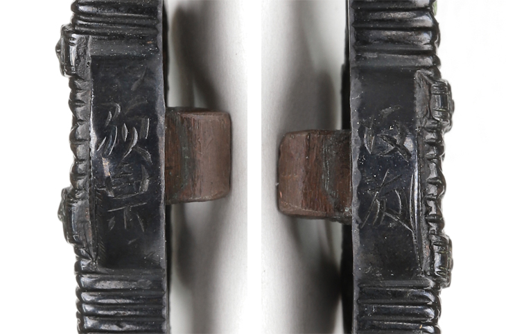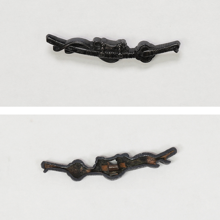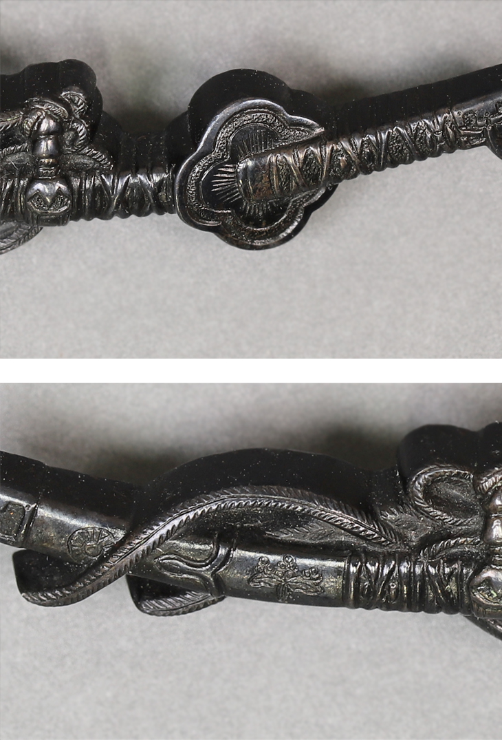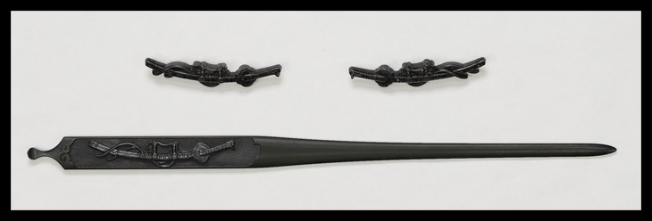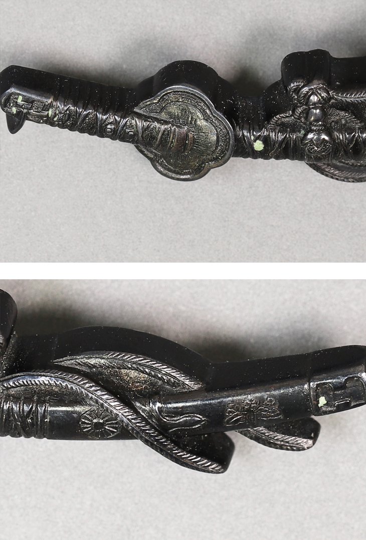 商品番号:VT-014 二所物:太刀図 笄 銘・後藤顕乗(花押) 目貫 割際銘・後藤 顕乗 第四十二回重要刀装具指定書付き
