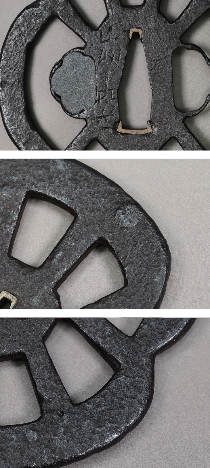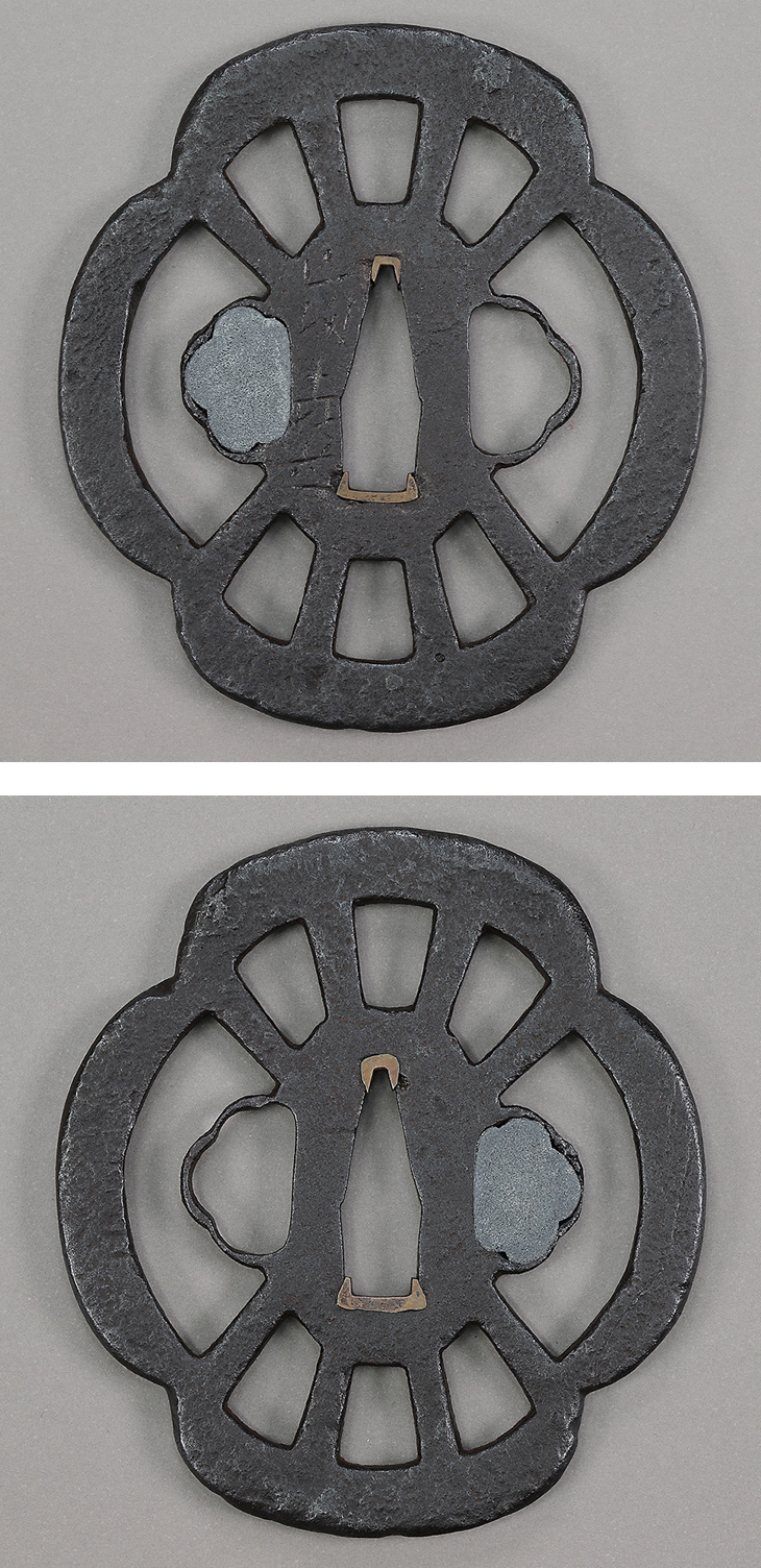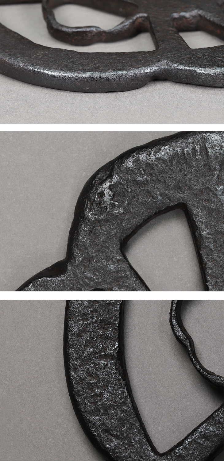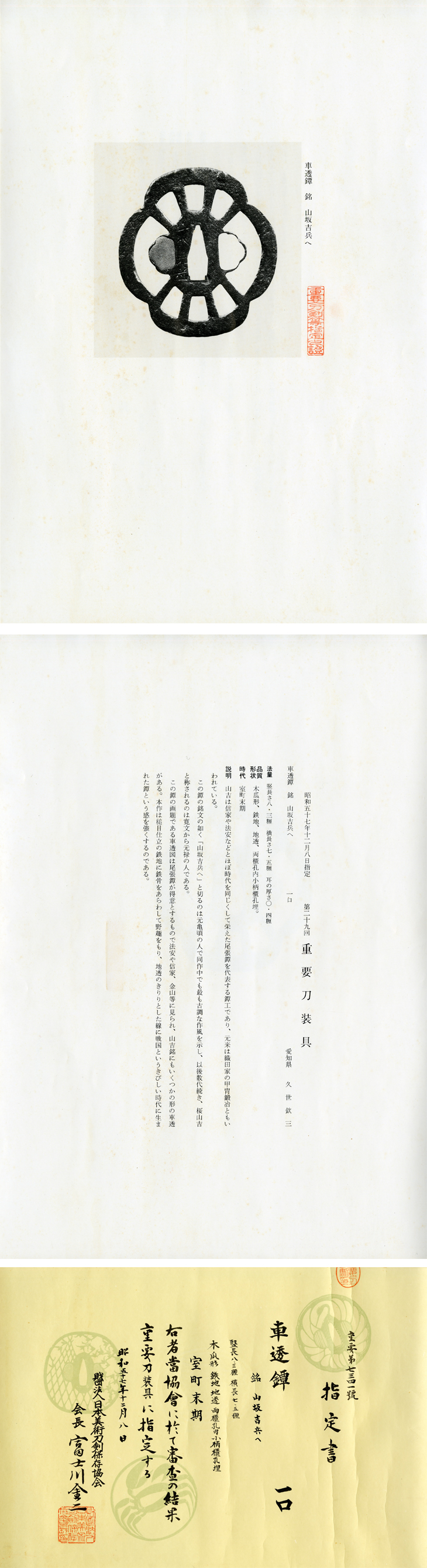 この鍔の画題である車透図は尾張鍔が得意とするもので法安や信家、金山等に見られ、山吉銘にもいくつかの形の車透がある。本作は槌目仕立の鉄地に鉄骨をあらわして野趣をもり、地透のきりりとした線に戦国というきびしい時代に生まれた鍔という感を強くするのである。」