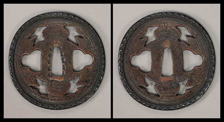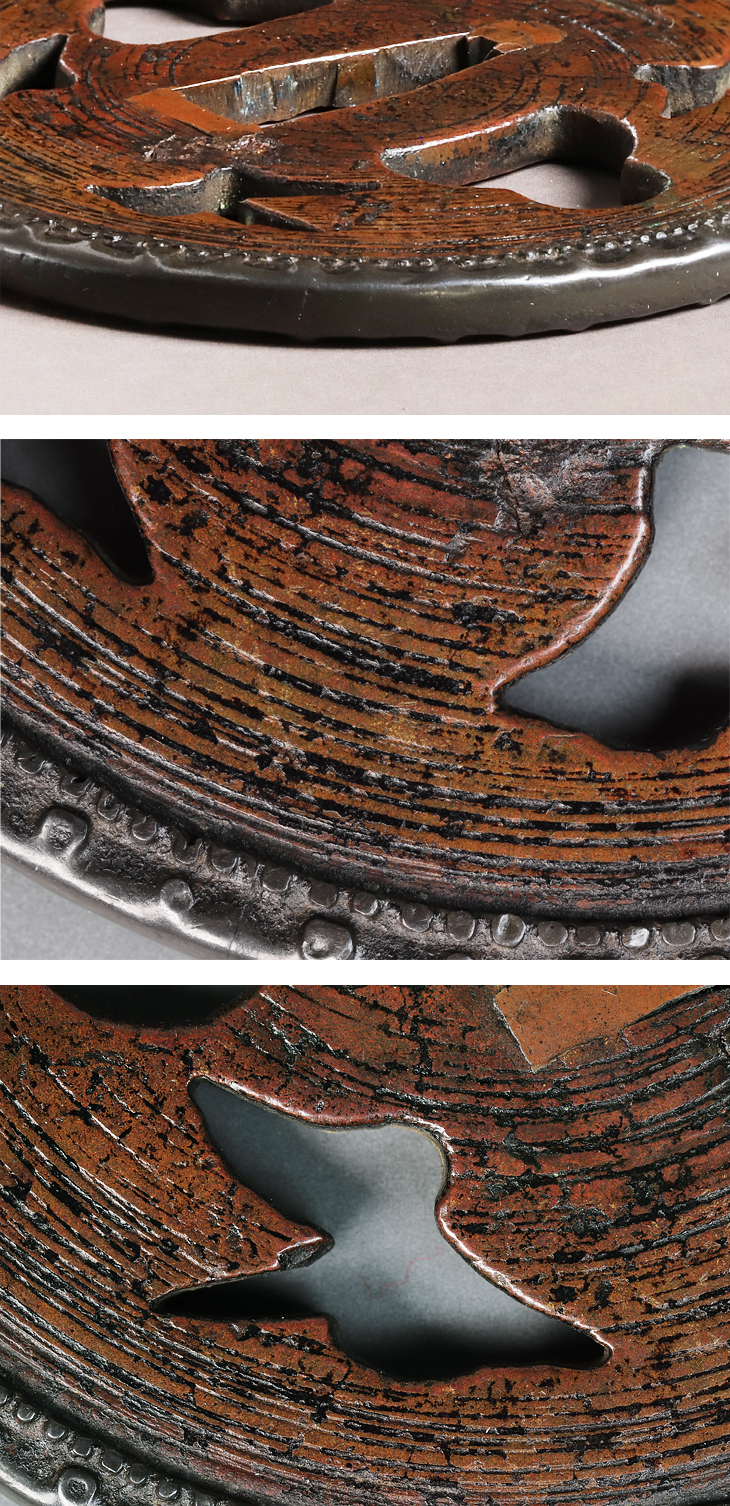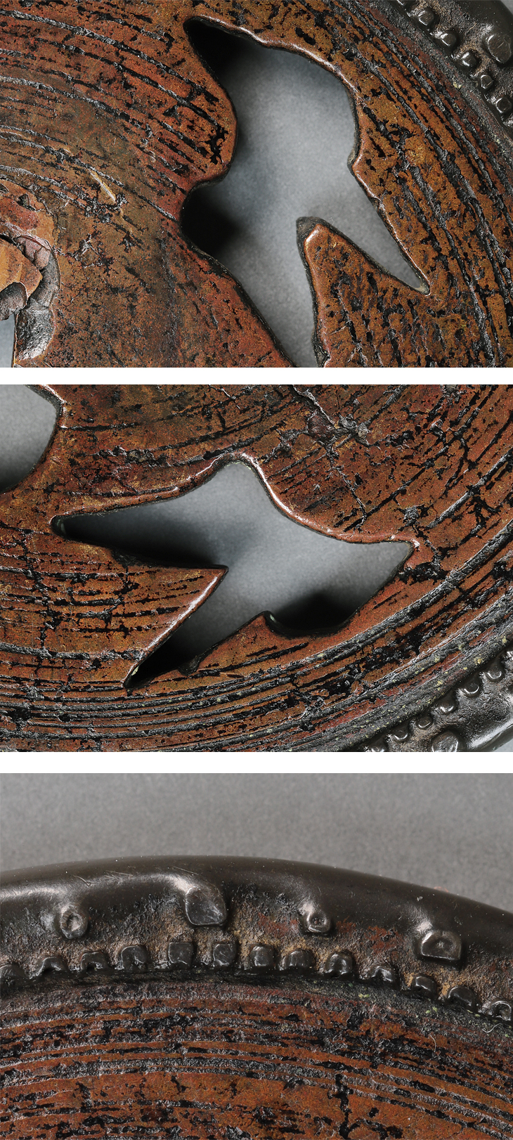 この鍔は赤味のある素銅の色がよく吟味されており、翁鑢と黒漆の馴染みにも雅味がある。四方に飛ぶ千鳥の姿は軽やかでくったくがなく、小田原覆輪は本格的で掟通りである。細川流茶道の美をあらわした彦三の本領が発揮されている。