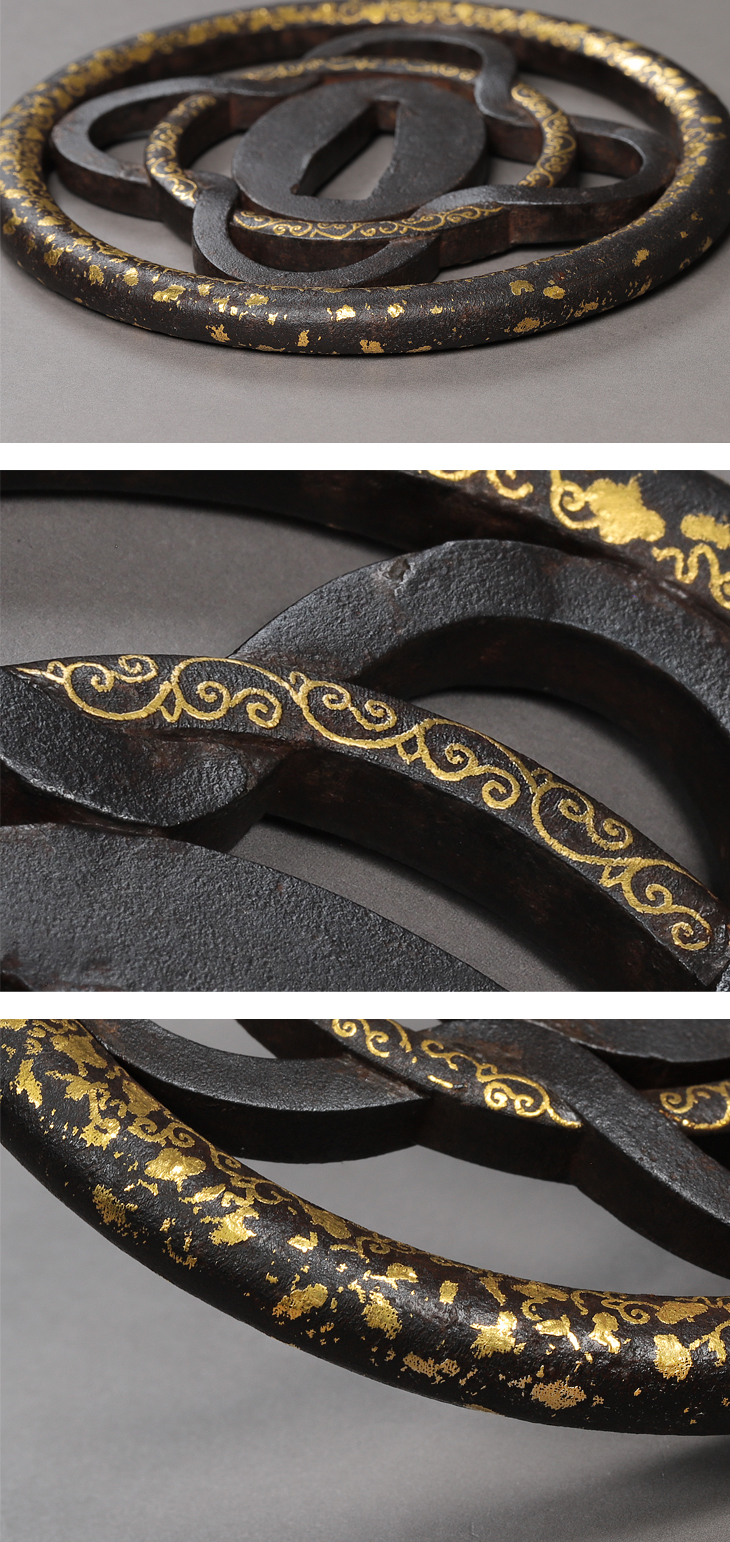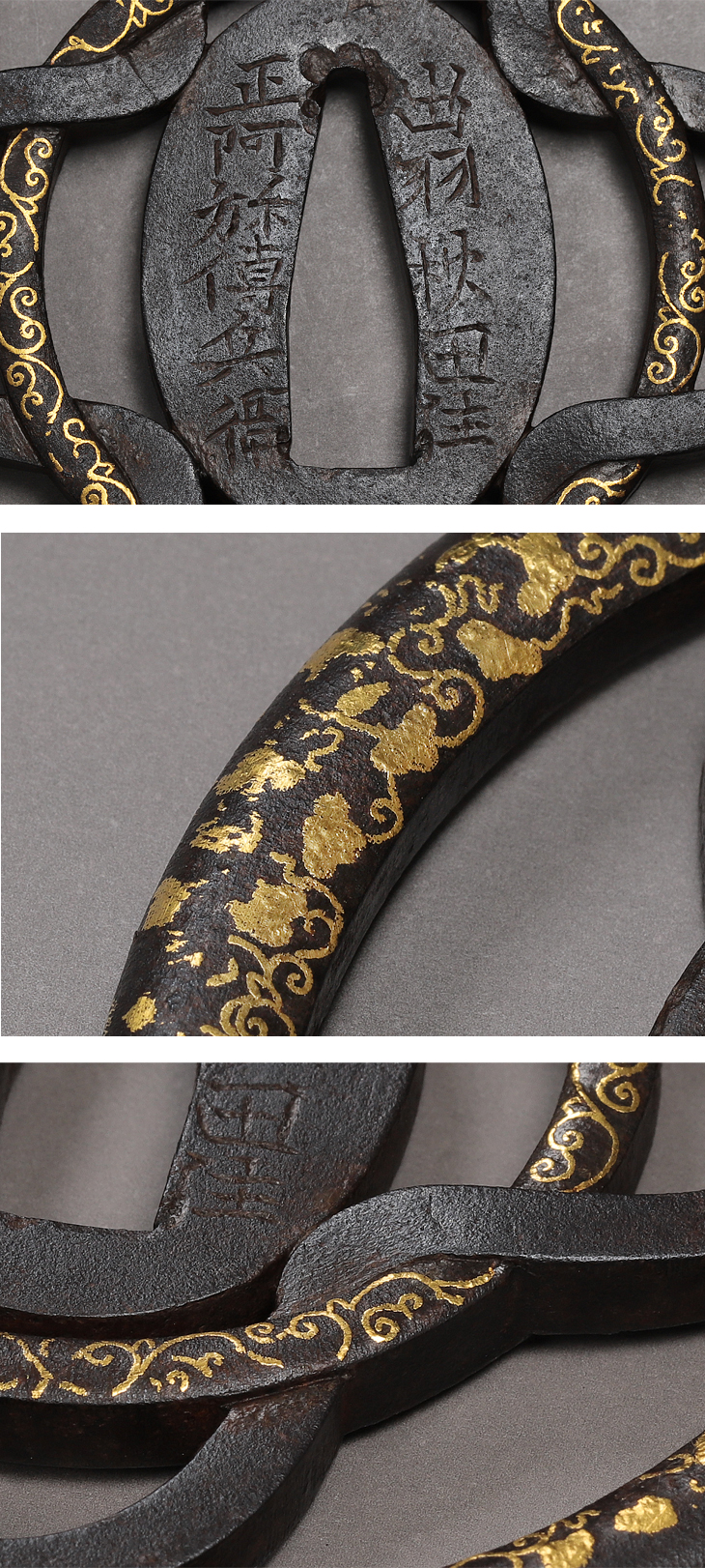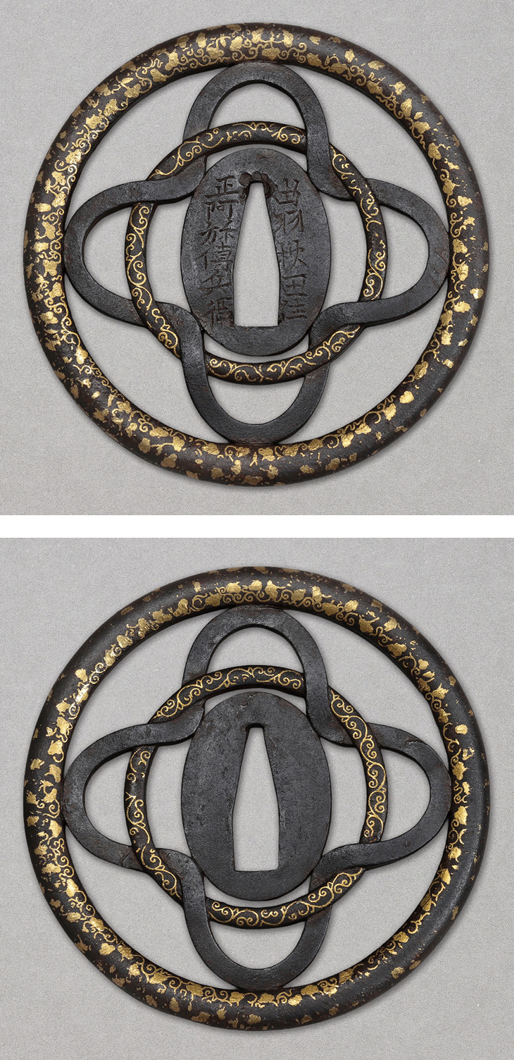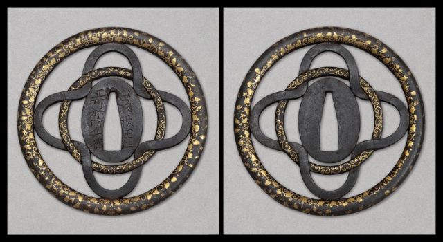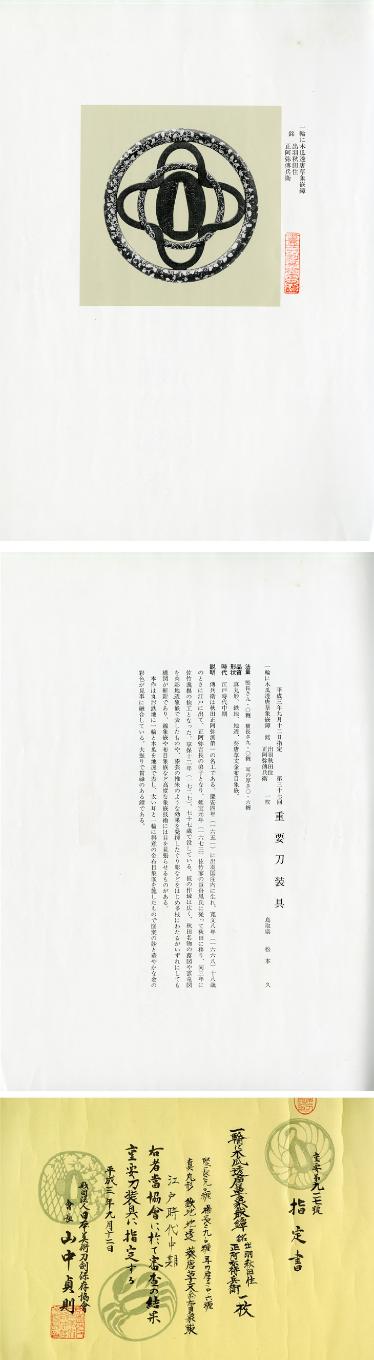本作は丸形鉄地に一輪と木瓜を地透で表し、太い耳と一輪に得意の布目象嵌を施したもので図案の妙と華やかな金の彩色が見事に融合している。大ぶりで貫禄ある鍔である。」